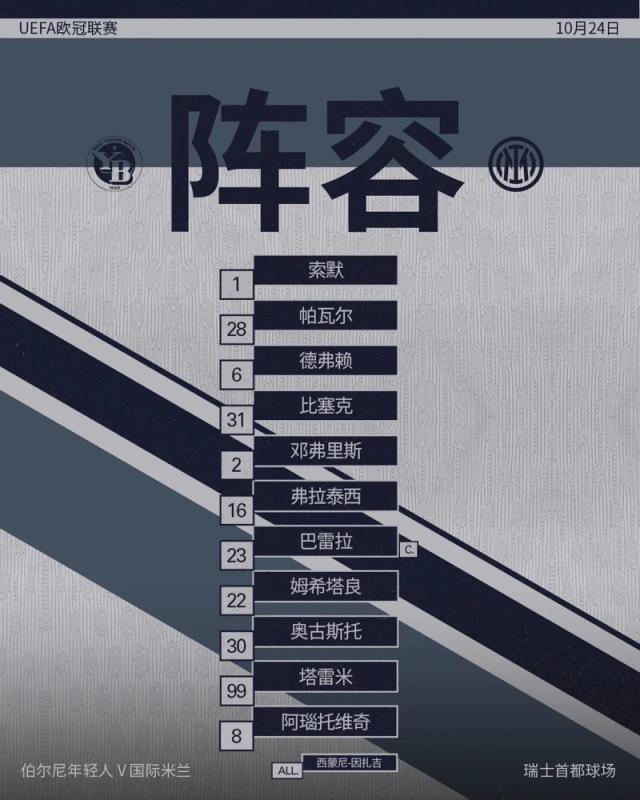 2024-25赛季欧冠联赛阶段第3轮,国际米兰客场对阵伯尔尼年轻人,凭借小图拉姆在补时阶段的绝杀球,国米客场1比0战胜对手。 第13分钟,若埃尔·蒙泰罗带球杀入禁区,邓弗里斯放铲将球踢出底线。 第18分钟,哈贾姆得球内切抽射,被佐默扑出底线。 第22分钟,维尔吉纽斯 接队友传中头球攻门,帕瓦尔门前做出关键解围。 第31分钟,奥古斯托传中,...