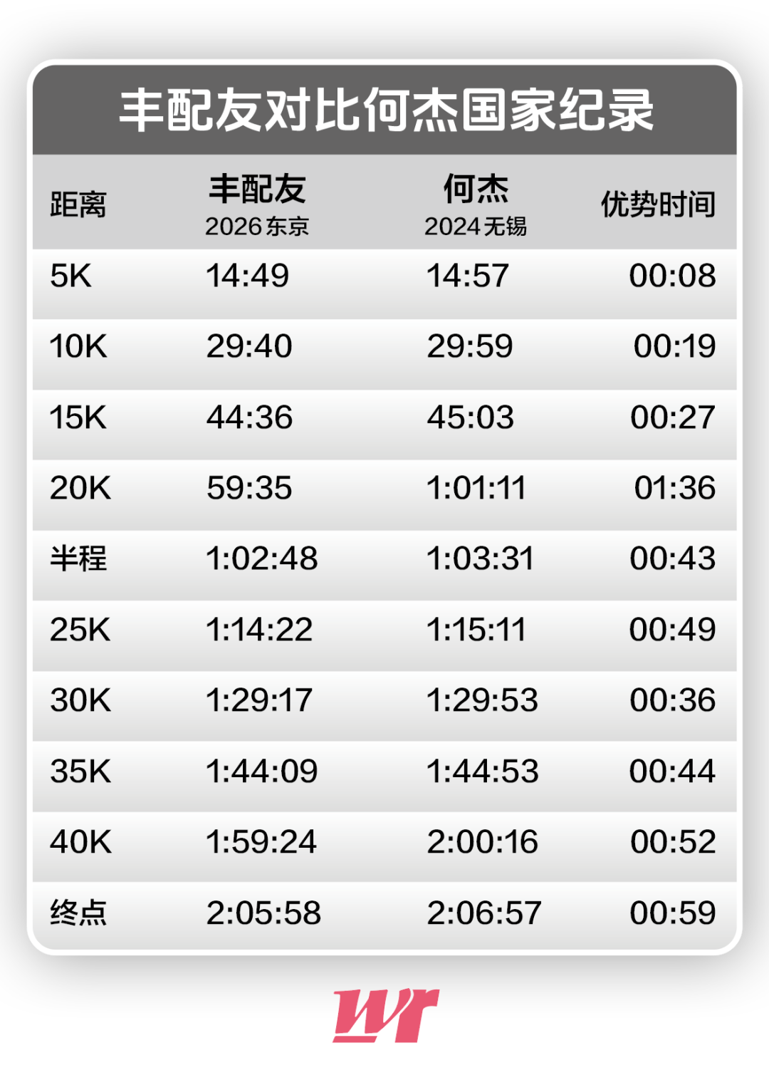 大迫杰以2小时05分59秒完赛,虽未能本土夺冠,但仍展现出顶级竞技水平。另一名日本选手铃木健吾以2小时06分09秒完赛。丰配友在完赛后脱口而出“感觉太爽了!”。这个PB不仅让他2024年瓦伦西亚跑出的2:07:06成为过去,也让2024年何杰在无锡马拉松跑出的国家纪录2:06:57就此封存。从3月1日起,中国马拉松男子国家纪录的拥有者从何杰变成了2001年出生的丰配友。虽然喜悦,但丰配友说,这不是自己的终极纪录,“亚洲纪录”才是自己的终极目标。