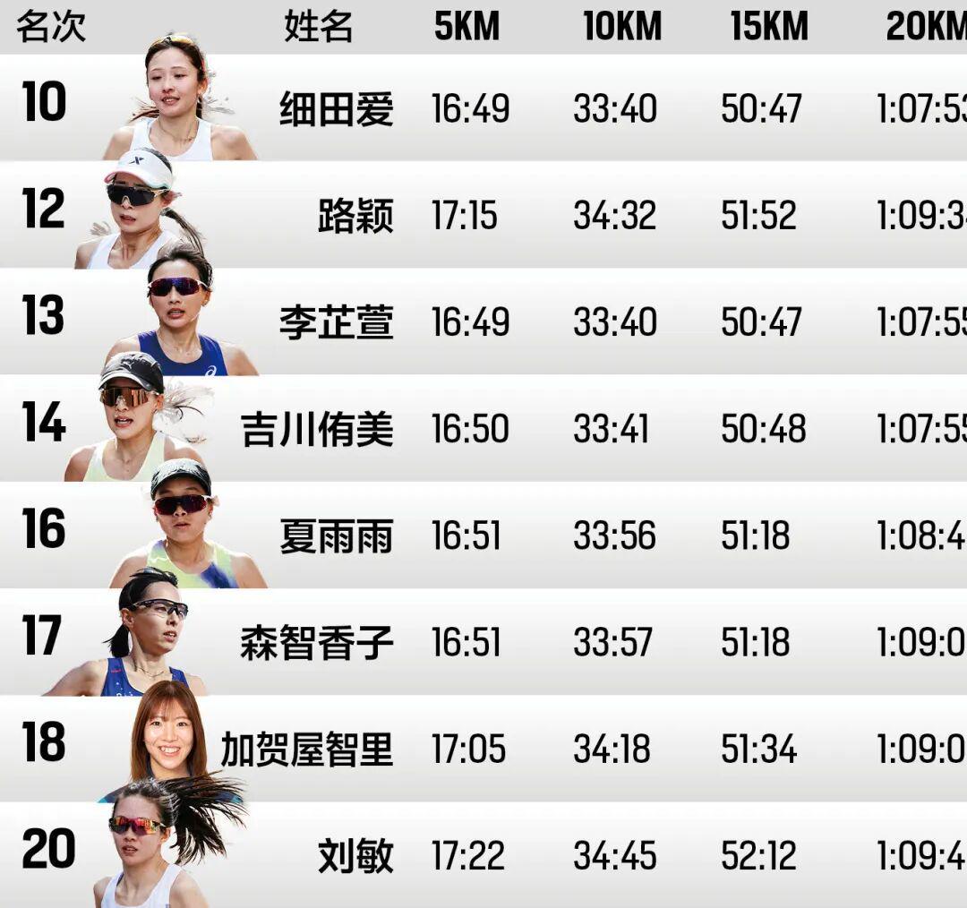 10公里时,李芷萱紧咬细田爱,10公里用时33分39秒,3分22的配速稍快。夏雨雨用时33分56秒,路颖用时34分32秒,刘敏和姚妙依旧跑在一起,用时34分45秒。15公里,细田爱和李芷萱依旧处于女子第二集团,李芷萱15公里用时50分47秒。整个前半程,女子选手方面相对稳定。科斯盖和克贝德继续领跑,半程用时1小时07分36秒。中国女选手中,李芷萱半马用时1小时11分39秒、夏雨雨用时1小时12分33秒、路颖用时1小时13分20秒、刘敏1小时13分38秒、姚妙1小时13分40秒、徐冰洁1小时15分。一直以“安全完赛”为目标的李芷萱到半程后还安慰自己,“希望后面可以不退赛”。